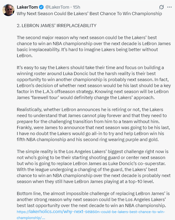 不管勒布朗是否在明年夏天退役,下赛季都可能是他保持联盟前十水准的最后一年,湖人需要抓住这个机会。