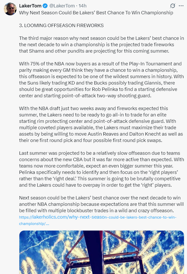 北京时间6月13日,湖人媒体Laker Tom记者汤姆-考德尔长文解析洛杉矶湖人队下赛季将是未来10年唯一的夺冠机会,他列举了四个理由,每一篇都是长篇大论,这里我就列出中心思想。
