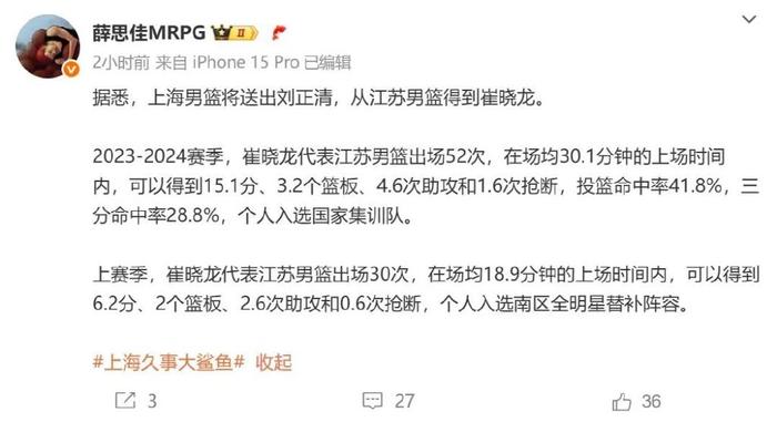 据相关媒体人透露,上海男篮与江苏男篮达成交易,用青训锋线刘正清换来了后卫崔晓龙。